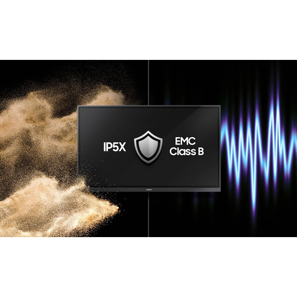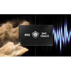 Безопасна работа, надеждна работа. Сертификати IP5X / EMC клас B. Samsung QB24C-T е съвместим с електромагнитна съвместимост (EMC) клас B, отговарящ на строги стандарти за безопасност и надеждност при работа. Освен това рейтингът IP5x на дисплея подчертава неговата здрава издръжливост дори в прашна среда.