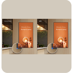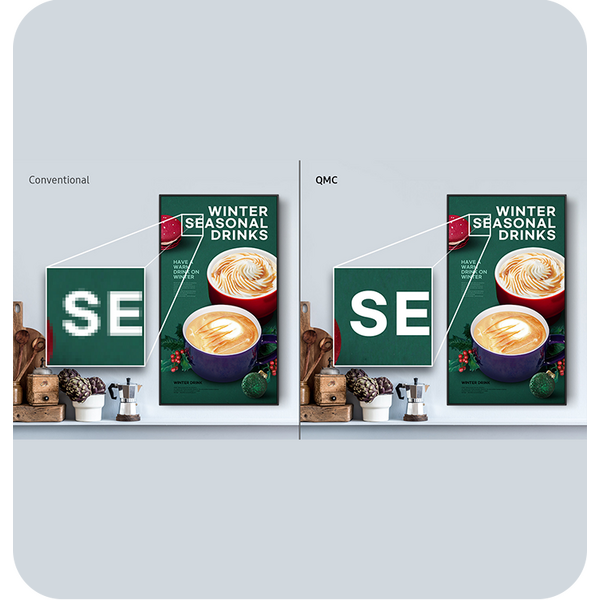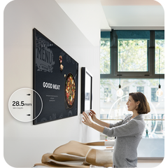 - Максимално въздействие в минимално пространство. Рекламен дисплей Samsung QB50C притежава изключително тънък и елегантен дизайн, който се вписва във всяка бизнес среда. Несравнимата ултратънка дълбочина от 28,5 мм на Samsung QB50C го прави най-тънкия модел в UHD серията на Samsung. Той е съвместим с тънка стойка за стена, която позволява да го инсталирате като пестите място и да постигнете елегантност на визията.