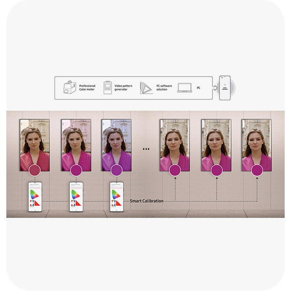 - Интелигентно калибриране. Изключително лесно, използвайки мобилното приложение на Samsung - Smart Calibration можете за миг да калибрирате рекламен дисплей Samsung QB50C. Точният цвят на марката, логото е гарантиран.