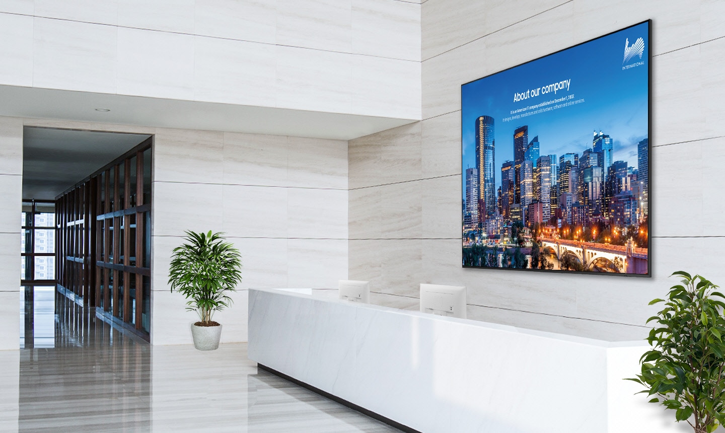 Широкоформатен публичен дисплей 82" Samsung QE82T предлага изключително елегантен бизрамков дизайн, подходящ за всяка бизнес среда.