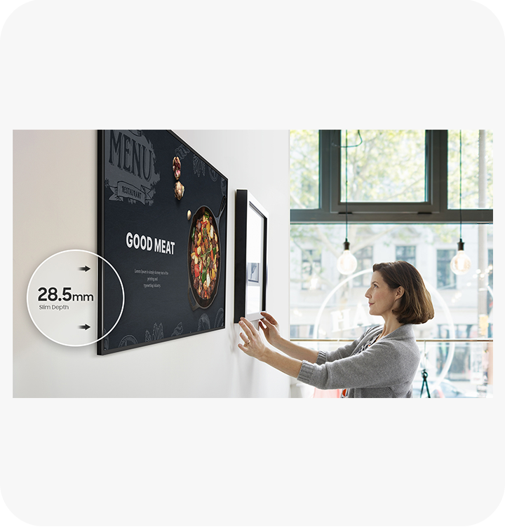 Компактност и функционалност. Рекламен дисплей Samsung QH75C има изключително тънка рамка 28,5 mm, чрез която дисплеят има елегантен бизнес дизайн и лекота. Дизайнът на рекламен дисплей Samsung QH75C го прави подходящ за всяко пространство.