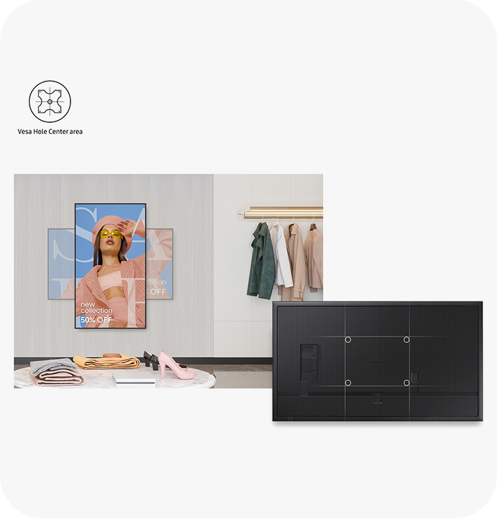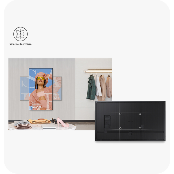 Пейзаж и портрет. Рекламен дисплей Samsung QH75C притежава още една изключително удобна функционалност - възможността за монтаж в пейзажен и в портретен режим. В пространство, в което се търси мексимално оползотворяване на място или нестандартен ефект, портретния режим на работа е изключително удобен.