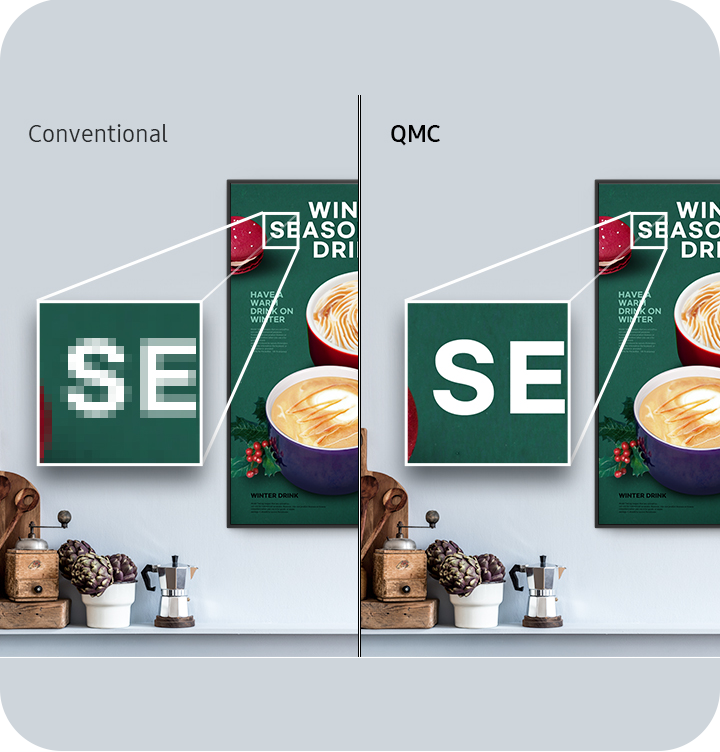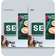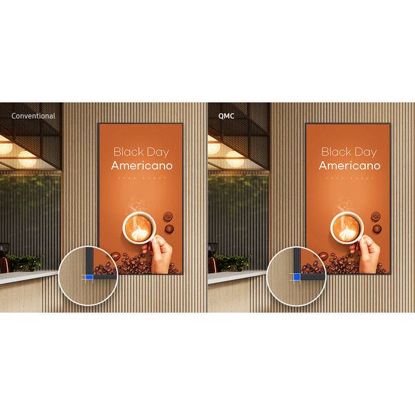 Екран без отблясъци. Изключително важно е, когато рекламният дисплей Samsung QH75C е монтиран в търговска зона или на обществено място, качеството на картината да е безупречно и без отблясъци от дневна или силна изкуствена светлина. Всички дисплеи от серията на Samsung QHC разполагат с надеждни панели с покритие против отблясъци, които осигуряват по-добра видимост от всички ъгли, по всяко време на денонощието. Дисплеите с антирефлексно покритие позволяват на бизнеса да предоставя точна информация на критични места, като летища и гари.