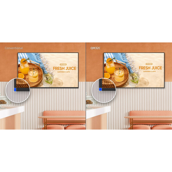 Samsung QM32C е нов модел впечатляващ рекламен дисплей с ултратънък дизайн, превръщащ го в ефективно решение за реклама на продукти или излъчване на информация в търговски обекти, кафенета, рецепции, информационни центрове. Размера от 32" на рекламен дисплей Samsung QM32C е изключително удобен за оползотворяване на ценна търовска площ, тъй като е достатъчен за перфектна видимост и фокусиране на вниманието на клиента в тесни и ограничени рекламни пространства.