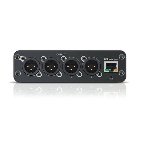 - Преобразува цифров аудио сигнал Dante™ в четири дискретни линейни/микрофонни аналогови сигнала.