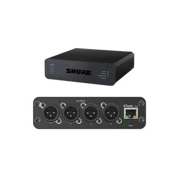 Shure ANI4OUT-XLR е мрежов аудио конектор, който преобразува цифров аудио сигнал Dante™ в четири дискретни линейни/микрофонни аналогови сигнала за лесно аудио маршрутизиране и удобно дистанционно управление, базирано на браузър.