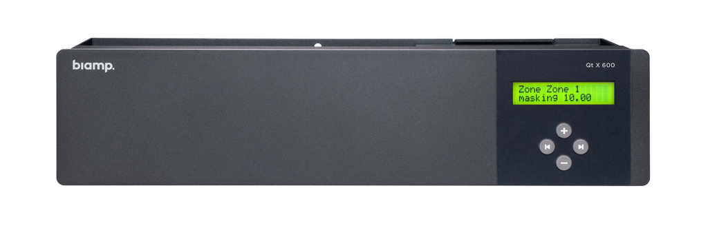 Всяка зона може да бъде уникално конфигурирана за ниво на Sound Masking, спектър и спомагателен звук, което позволява на системните дизайнери да приспособят звуковото покритие към акустичните и оперативните нужди на всяка зона. Два спомагателни входа позволяват интегрирането на пейджинг системи или фонова музика, докато AVB или Dante свързаността (вариант Sound Masking Biamp Cambridge Qt X 600D) позволява синхронизирано споделяне на звук между множество контролери. С интелигентни функции като автоматично линейно управление, планиране на събития и вградена синхронизация на NTP часовник, Sound Masking Biamp Cambridge Qt X 600 осигурява постоянна производителност през целия ден. LCD интерфейсът на предния панел осигурява локален достъп, докато уеб-базираният интерфейс за управление позволява дистанционно наблюдение и конфигуриране.