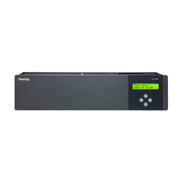 Sound Masking Biamp Cambridge Qt X 600 е контролер за маскиране на звук и разпределение на звука от следващо поколение, предназначен за големи пространства до 6690 м², изискващи прецизно управление на акустиката и функционалност за пейджинг. Комбинирайки генератор за Sound Masking, еквалайзер с третооктавна лента, усилвател и мрежов контролер в едно компактно устройство, Biamp Cambridge Qt X 600 поддържа до шест независимо регулируеми зони със стандартни Biamp Qt или активни излъчватели.