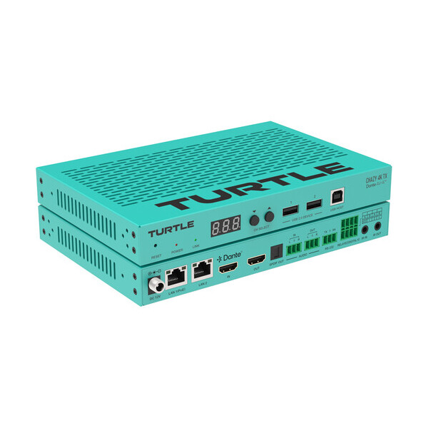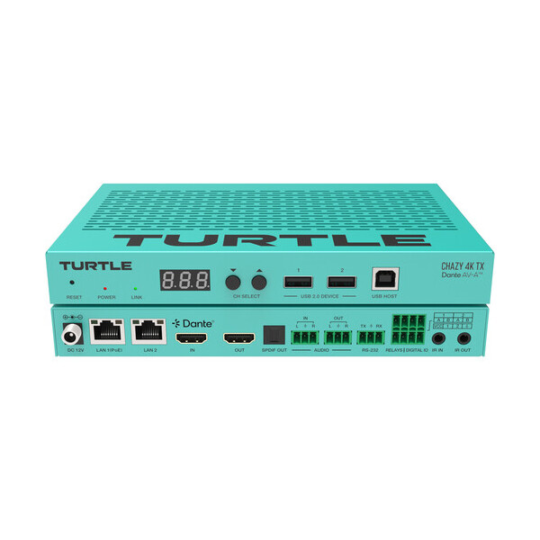 Turtle encoder Chazy 4K Tx е HDMI 2.0b Dante AV-A и JPEG 2000 енкодер, предназначен за предоставяне на 2160 60Hz 4:4:4 HDR видео. Лицензът Dante AV-A е включен и готов за работа. Turtle encoder Chazy 4K Tx се захранва с PoE и поддържа широка гама от аудио формати, включително 7.1 Dolby Atomos, и разполага с разширени възможности като KVM, конфигурации на видеостена до 9×9, хардуерно мащабиране, EDID управление, HDCP 2.2, истинска мултикаст поддръжка и двойни мрежови портове, които държат AV и контрола разделени. Съвместим с TAA. Turtle encoder Chazy 4K Tx се предлага и с 5-годишна гаранция.