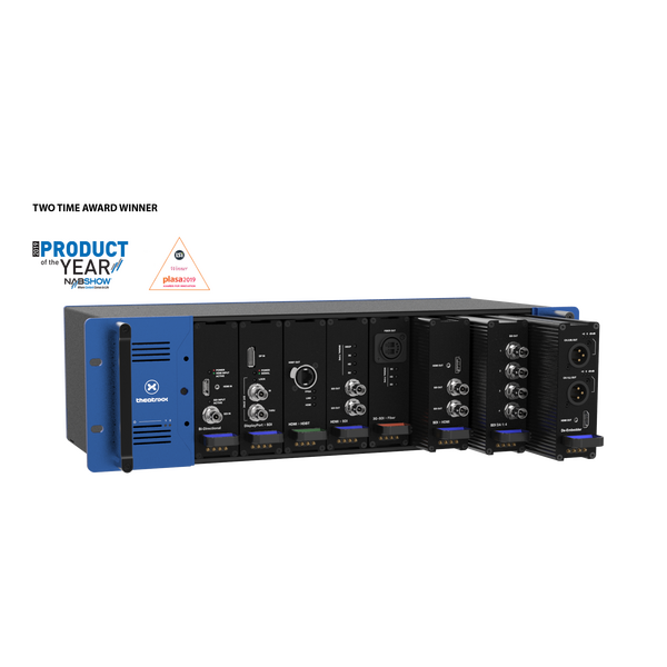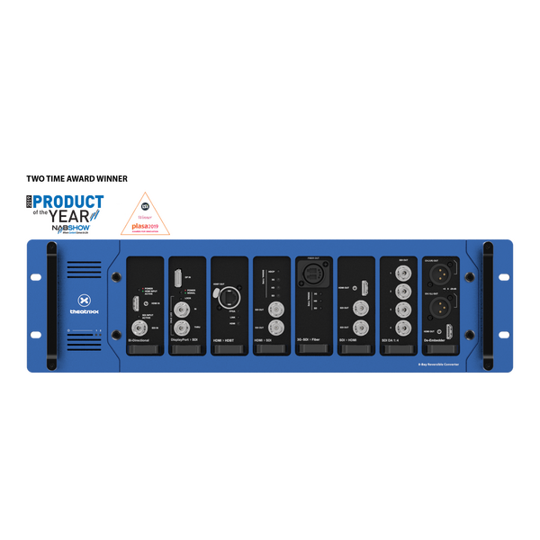 Системата Theatrixx Reversible Converter е естественото продължение на наградената линия xVision Converter, която се предлага в модулен формат за монтиране в шкаф със същото качество на обработка и надеждност, които са отличителният белег на марката xVision. Модулният дизайн позволява всяка система да бъде конфигурирана точно според нуждите и дори преконфигурирана в движение, с множество налични модули, включващи SDI, HDMI, Fiber, HDBaseT и др. Хост модулът с 8 слота, 3RU разполага с двойни, извънгабаритни захранвания за ненадмината надеждност и практически непрекъсната работа. Захранванията са конфигурирани за автоматично превключване в случай на повреда със светодиоди в предната част на модула, показващи състоянието. Мрежовото захранване се доставя чрез конектори PowerCON True1 с двойно заключване. Модулите могат да бъдат поставени във всяка посока, което позволява входовете/изходите да бъдат позиционирани отпред или отзад на модула в зависимост от приложението. Няма открити платки, тъй като всички модули са затворени и следователно защитени срещу статичен удар, прах и общо износване. Позлатени пружинни щифтове с магнитно задържане доставят постоянен ток към модулите, като по този начин не са необходими кабели и външни захранващи модули. Theatrixx Reversible Converter системата е перфектна за инсталации от висок клас под наем, събития на живо, броудкастинг и всяко друго приложение, изискващо професионално и надеждно решение за конвертиране/обработка на видео с висока плътност. Системата е готова за бъдещето и редовно ще се добавят нови модули. Theatrixx 8-Bay Reversible Frame елиминира нуждата от стелажни рафтове и велкро, осигурявайки професионално решение за разпространение и преобразуване на видео.